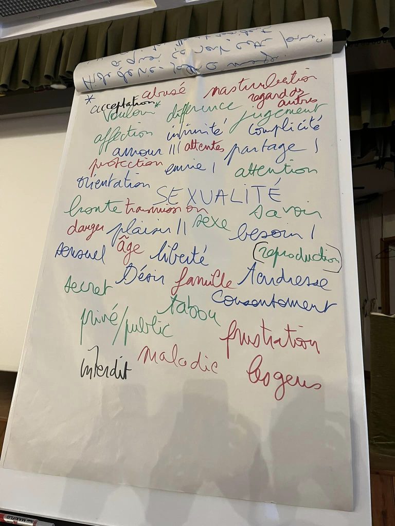 La première matinée a été consacrée aux représentations des participants sur la vie affective et la sexualité. Nous avons ensuite parlé sexualité à travers les références sociales, culturelles et religieuses, ce qui a permis aux stagiaires de comprendre qu’il existe trop souvent un grand décalage entre leurs représentations de la sexualité et celles des autres, notamment de celles de ceux qui la vivent.