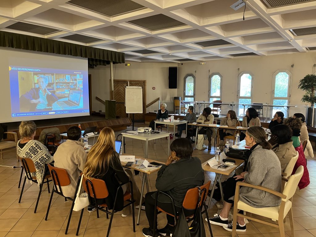 « Beaucoup d’interrogations quand Stéphane présente le module de notre formation spécifique aux personnes LGBTI+, aux personnes atteintes du VIH. Les vidéos des témoignages atteignent le public au cœur. Beaucoup de sentiments d’émotion seront exprimés. Et une reconnaissance du manque d’infos à ce sujet.
