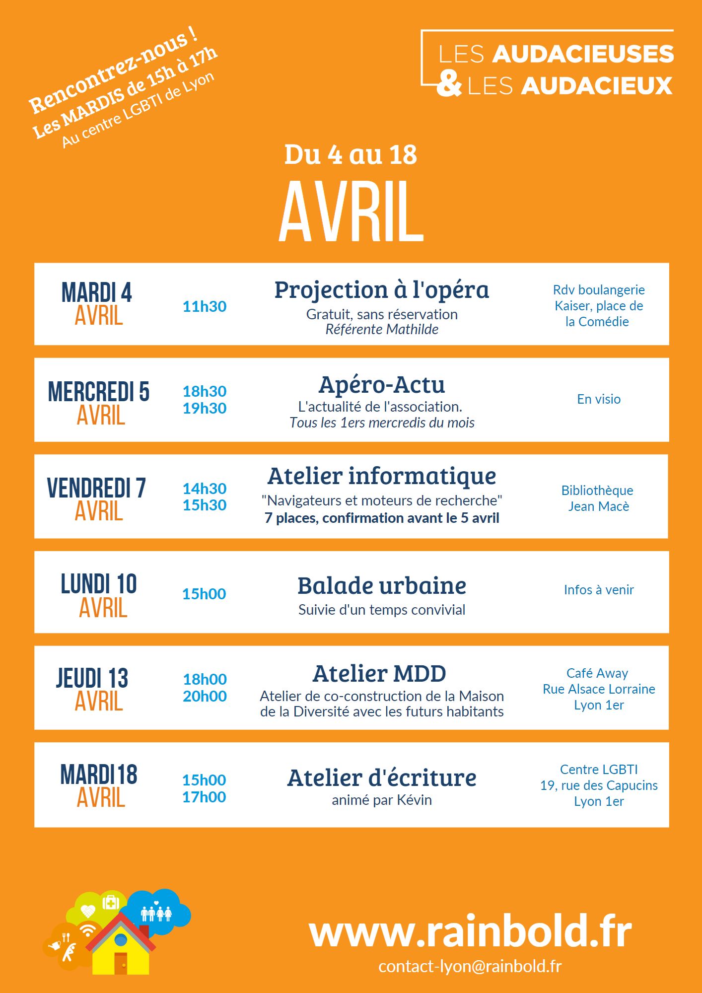 3 avril 20233 avril 2023 Marie Asso Les Audacieuses et Les Audacieux, Lyon Voici les activités programmées à Lyon pour le mois d’avril. Si vous souhaitez nous rencontrer, rendez-vous tous les mardis de 15h à 17h au Centre LGBTI, 19 rue des Capucins, Lyon 1er. Lyon, Programmation